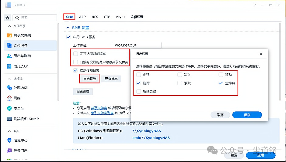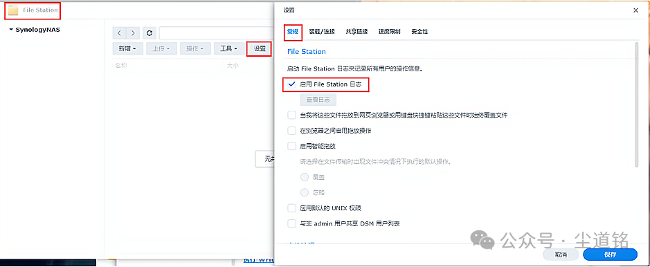▼日志启用除了SMB服务的日志设置,还需要在FileStation中启用网页访问的日志。