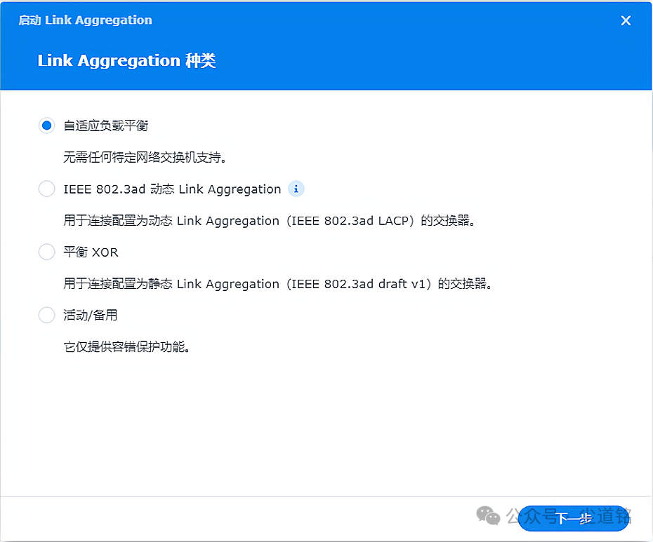▼如果是多网口设备,还支持网口的链路聚合,增加设备的访问带宽,聚合的效果要看使用的聚合模式和所用的交换机型号是否支持聚合(聚合操作可参考前文)。群晖设备提供了四种聚合模式,如果想要达到增加带宽的效果需要选择动态或者静态聚合模式。