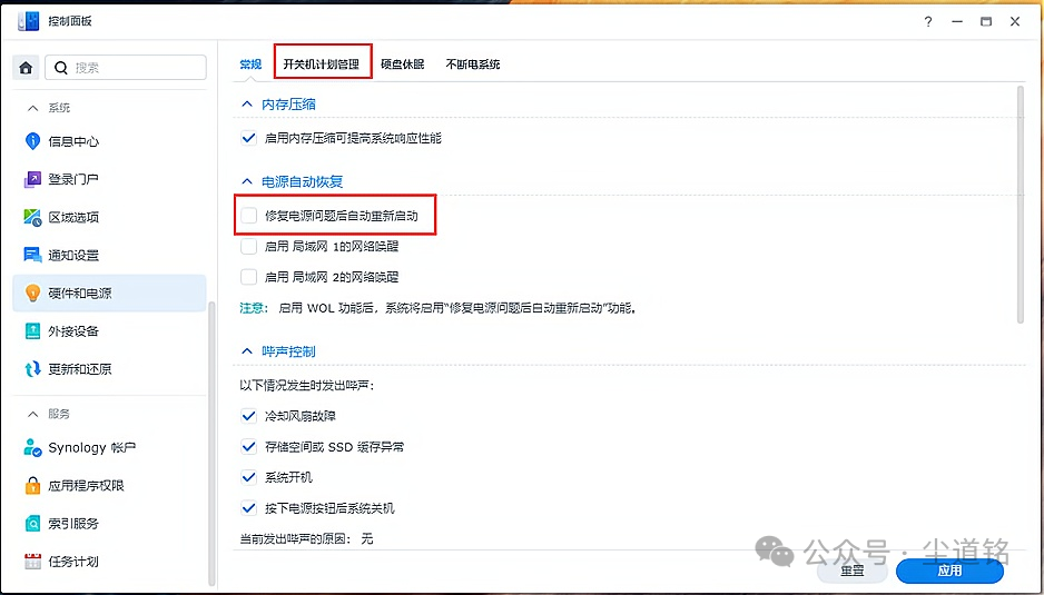 如果您使用的环境电力不稳定,可以勾选“修复电源问题后自动重新启动“,当来电的时候设备会自动开机,不需要手动操作。或者设置定时开关机来管理设备。