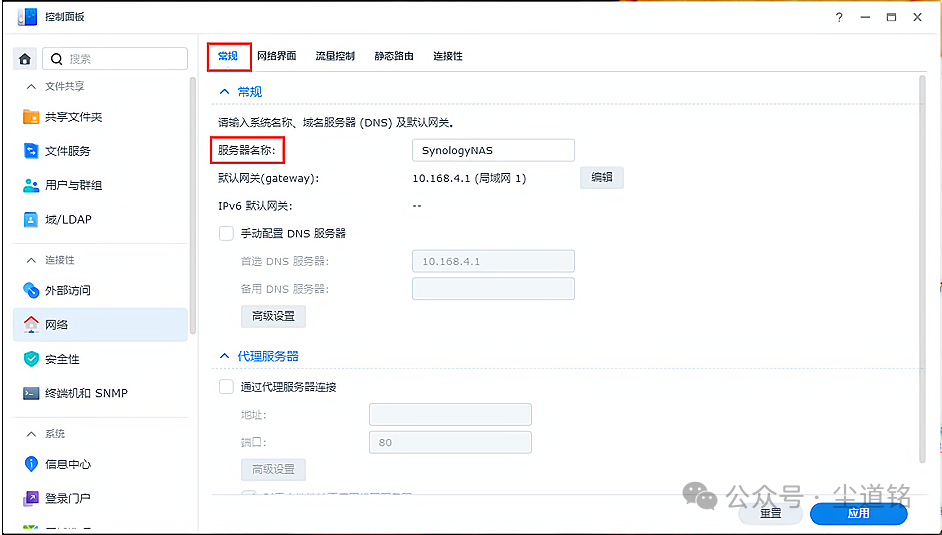 ▼“常规”可以查看默认网关、DNS服务器、代理服务器和IPv6隧道等信息,还可以对服务器名称进行修改。