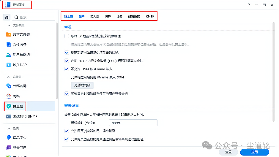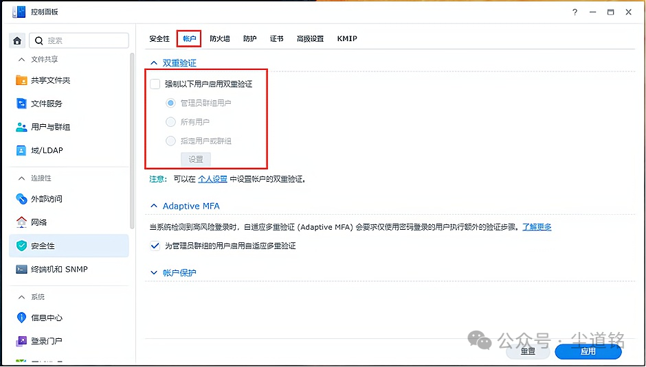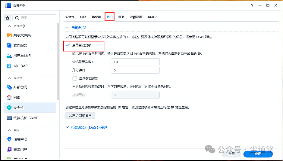 ▼安全性中可以启用账户的双重验证(可为DSM帐户提供更进一步的安全保护)和启用自动封锁名单(通过登录失败次数的设置来封锁恶意登录系统的客户端IP提高NAS的安全性)