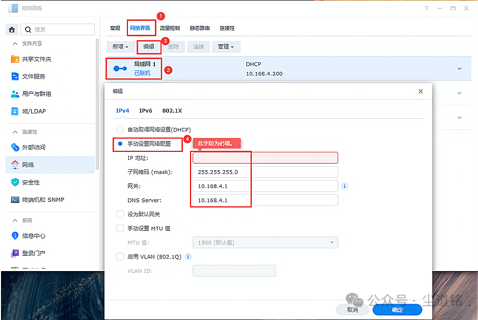 ▼网络界面最主要的设置就是局域网IP地址的设置,点开“网络界面“选择所连接的局域网口,点击编辑后进行局域网IP地址的固定,固定IP也是为了方便用户的访问。如果选择自动获取IP地址,那么设备在重启后访问地址会改变,还需要重新搜索新地址,用户访问就不方便了。