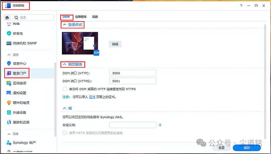 用户可以为DSM系统创建单独的登录网页门户(可参考DSM系统安装文章),通过选择不同的模板、更改背景图像或添加标志来自定义登录屏幕的登录样式。