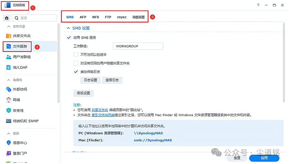 在控制面板 > 文件服务中启用相关选项后,Windows、macOS 和 Linux 用户可通过网络访问您的 Synology NAS。