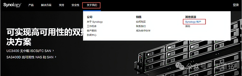 ▼还可以登录群晖官网www.synology.cn,在“关于我们”—“其他资源”—“Synology帐户”中注册,注册完成后添加设备信息或者登录DSM系统进行登录。